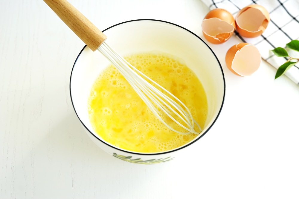 Приготовить тесто для чак-чака. В глубокую миску вбить яйца и добавить соль. Размешать яйца с помощью венчика или вилки. Не нужно взбивать яйца. Их достаточно просто перемешать до однородного состояния, и чтобы соль растворилась в яйцах.