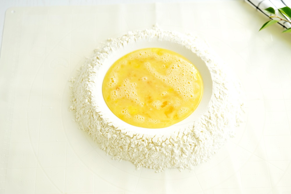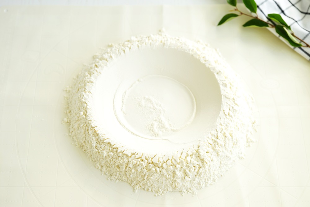 Высыпать на рабочую поверхность, заранее просеянную вместе с содой муку и сделать в муке углубление. Очень удобно формировать углубление в муке с помощью дна чашки.