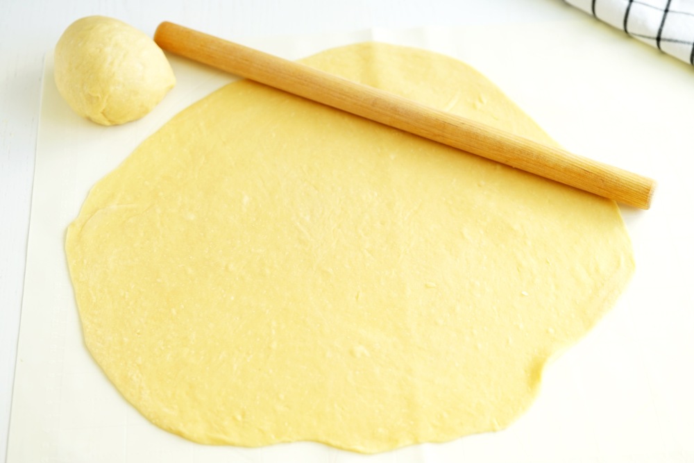 Разделить тесто на две части. Поочерёдно раскатывать каждую часть теста в большой тонкий пласт. Толщина пласта не должна превышать 3 мм.