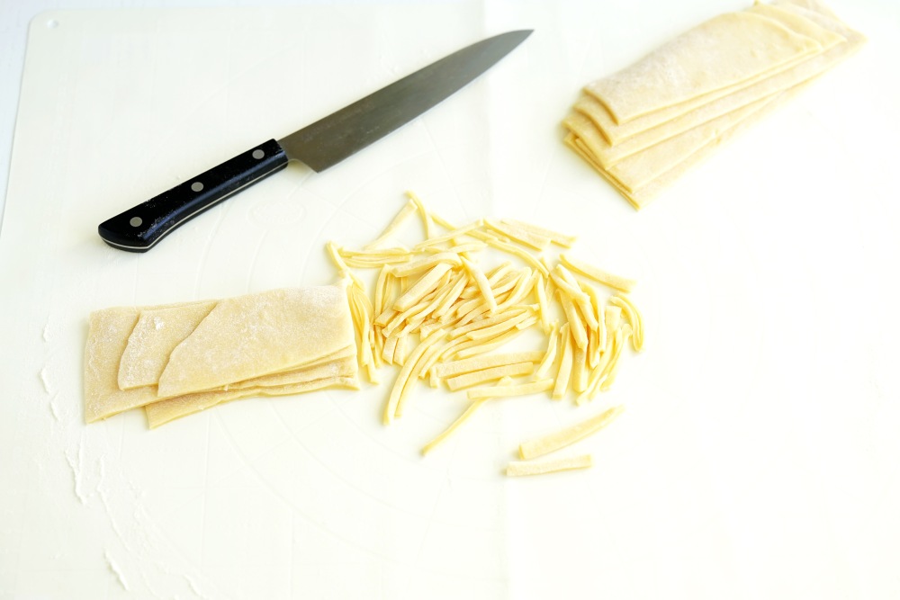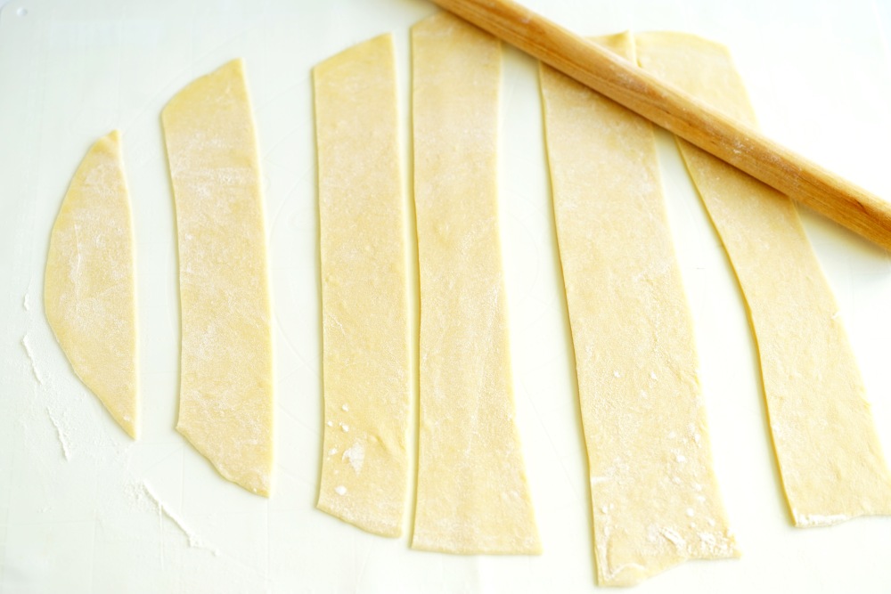 Выложить полоски друг на друга. При необходимости, слегка припылить мукой поверхность теста, чтобы оно не слиплось между собой. Нарезать тесто на кусочки шириной, примерно, 2-5 мм. Чем шире ваши кусочки, тем больше они будут после приготовления.
