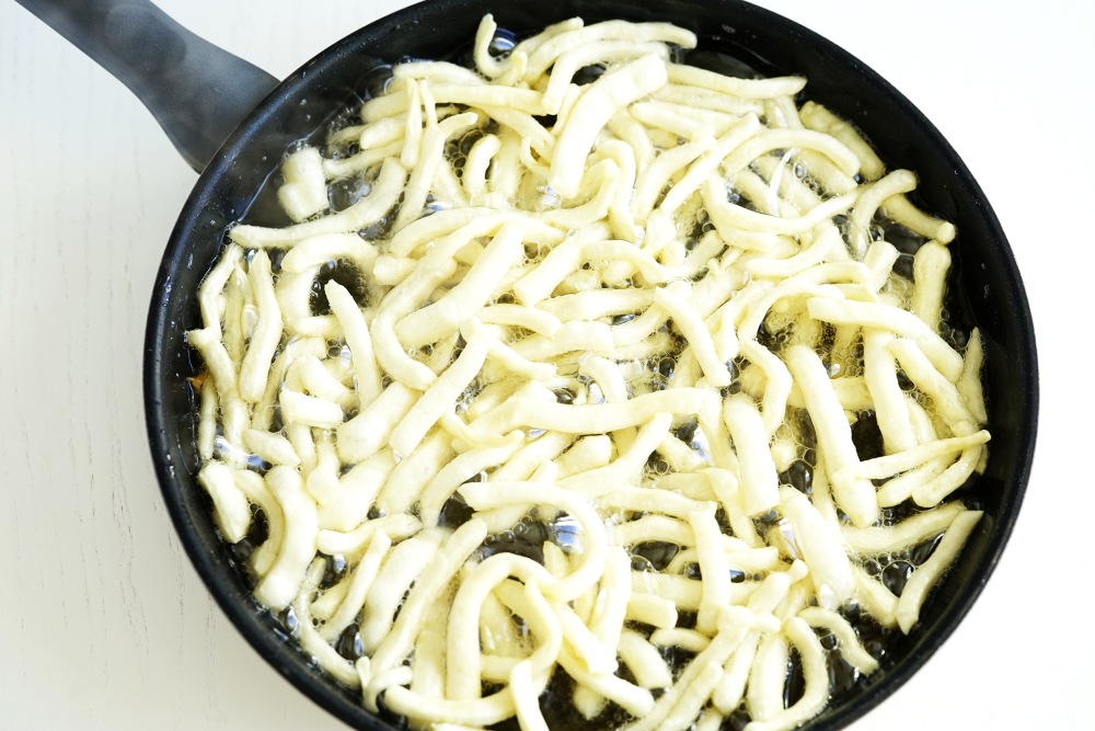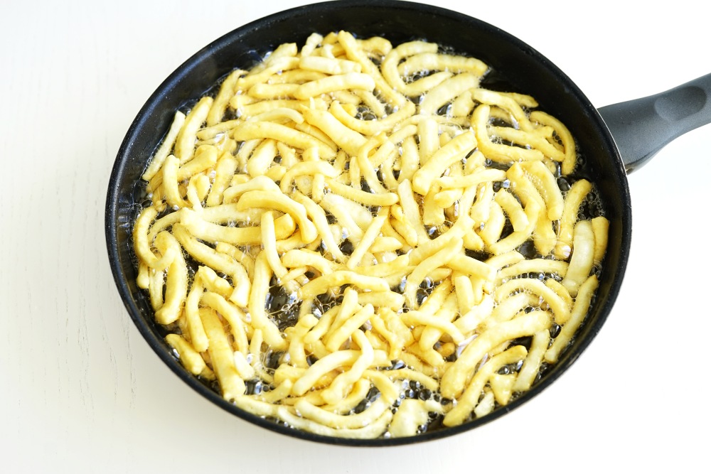 Выкладывать небольшими частями в раскалённое масло полоски из теста. Учтите, что тесто очень хорошо увеличивается в размере. Не выкладывайте слишком много теста одновременно.