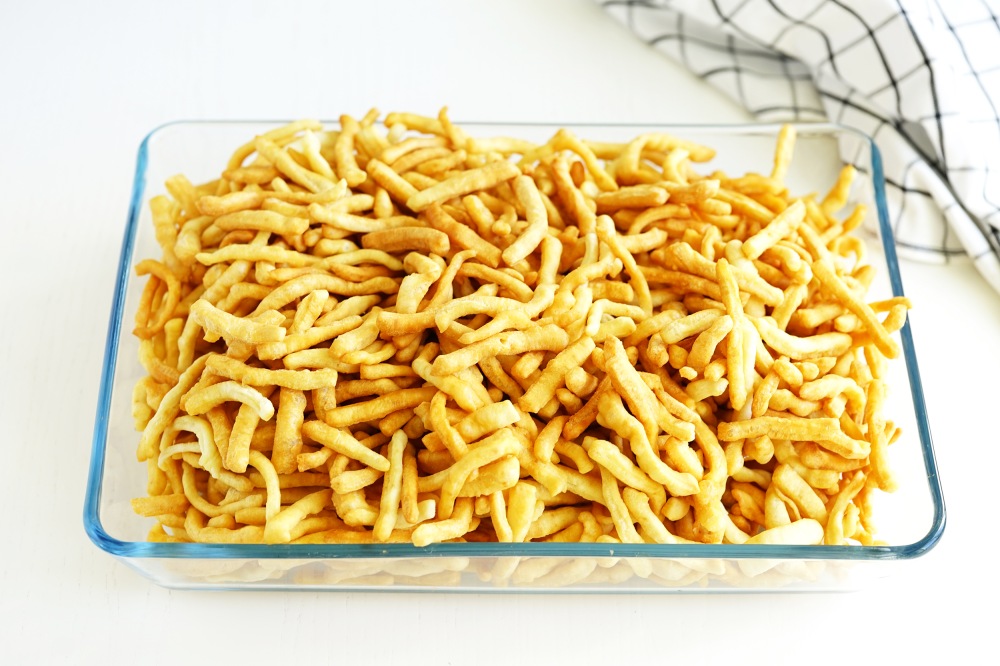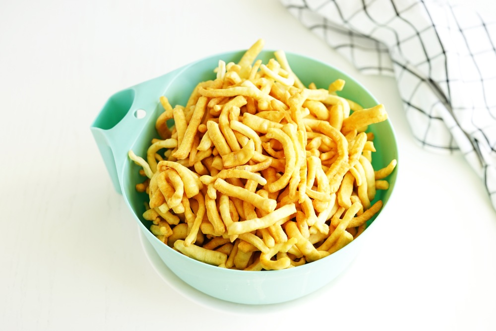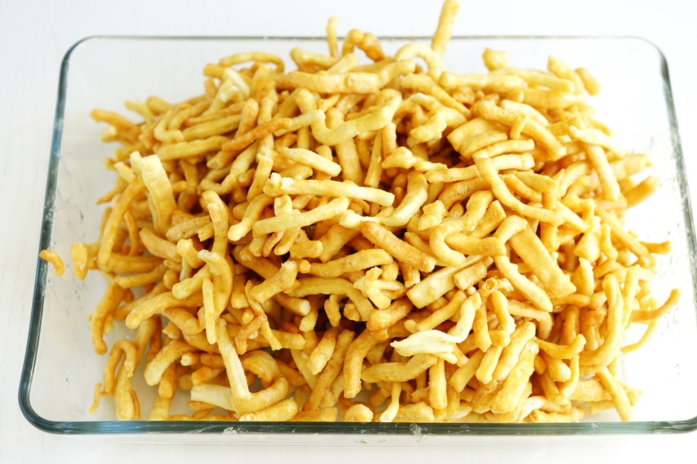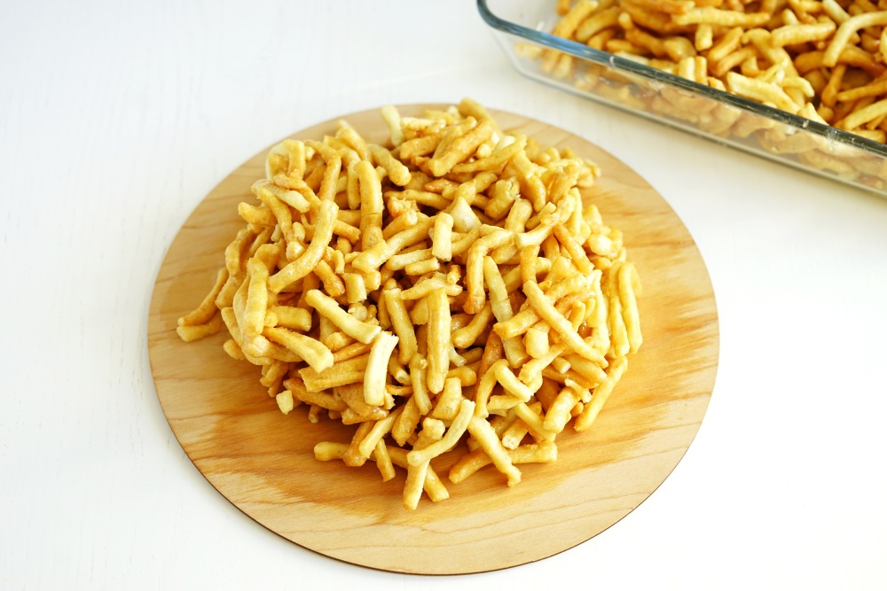Переложить заготовки из теста для чак-чака в дуршлаг или сито, чтобы лишнее масло стекло. Хотя, поверьте, вы его там даже не заметите.