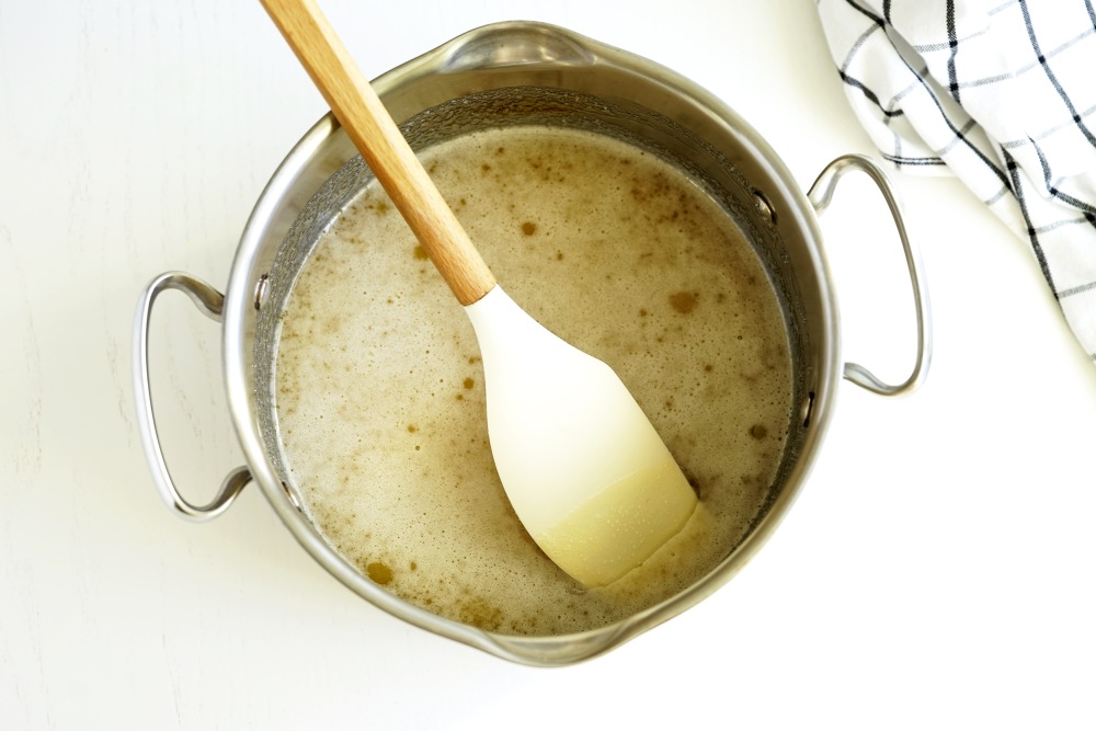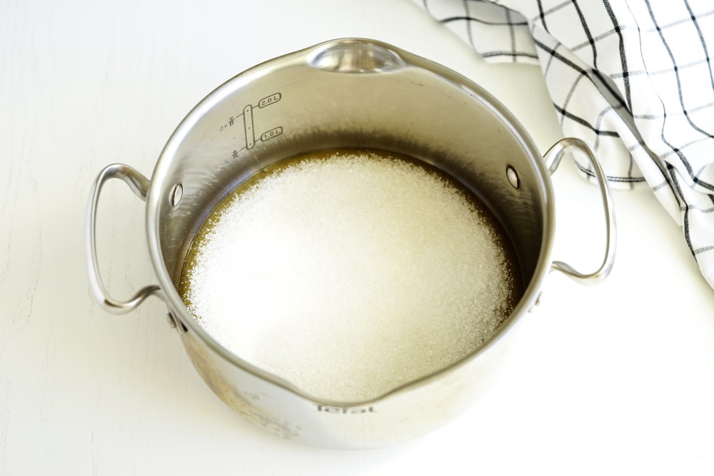 Довести мёд с сахаром практически до кипения, при постоянном помешивании сиропа. Сахар должен полностью раствориться в мёде. Сироп не должен кипеть.