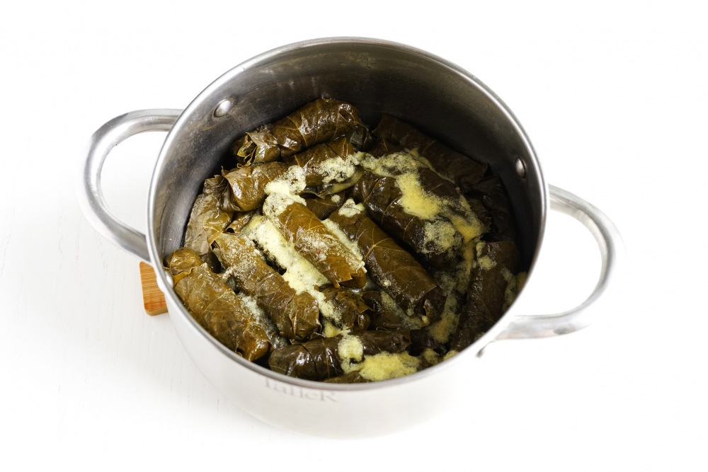 Влить в кастрюлю холодную воду и оставшееся оливковое масло. Закрыть крышкой и поставить на огонь. Готовить долму в виноградных листьях на огне чуть ниже среднего. Рис и мясо должны успеть приготовиться. В среднем, на приготовление уходит около 30 минут. Если во время приготовления вся вода впиталась, то нужно подлить ещё немного тёплой или горячей воды.