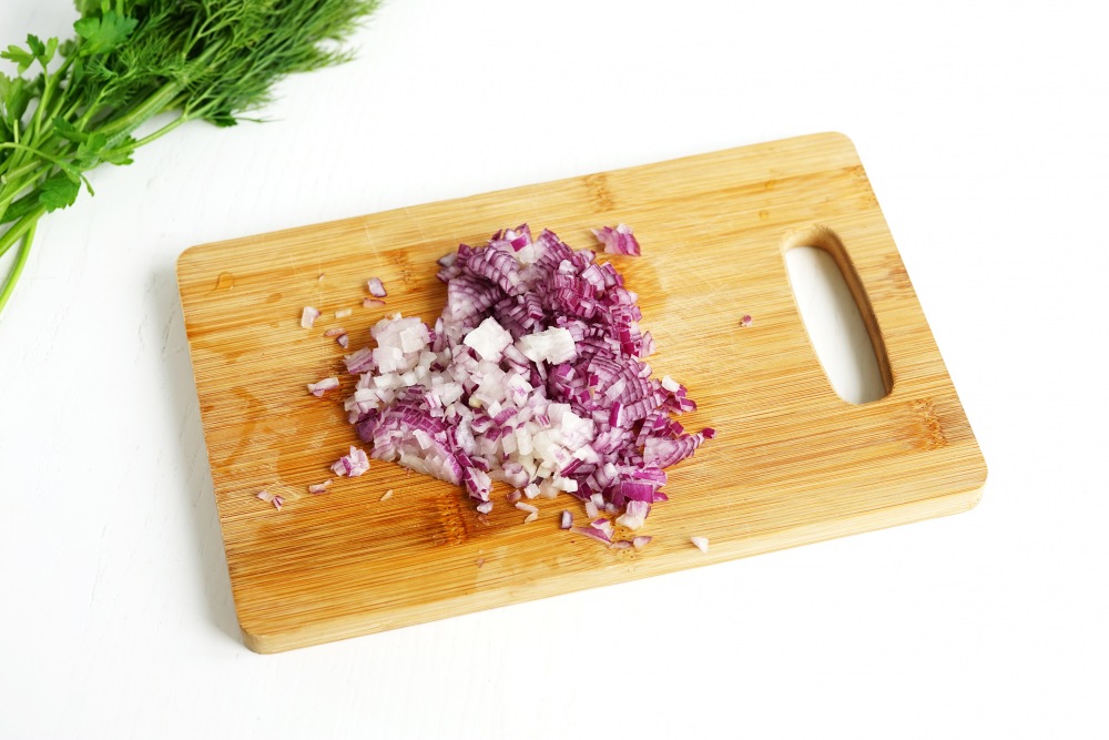 Очистить лук от шелухи и очень мелко нарезать. Лучше всего для рецепта использовать красный лук, но можно брать и лук шалот, а также белый лук.