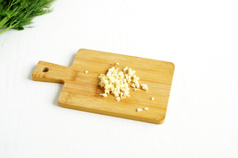 Очистить чеснок от шелухи и мелко нарезать или натереть на мелкой тёрке.