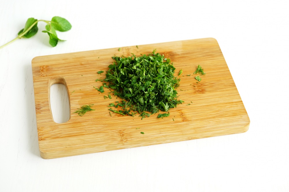 Подготовить зелень для долмы в виноградных листьях. Промыть зелень петрушки, укропа и мяты. Слегка обсушить. Удалить у петрушки и укропа жёсткий стебель. Листья мяты тоже освободить от жёсткого стебля. Нарезать мелко всю подготовленную зелень.