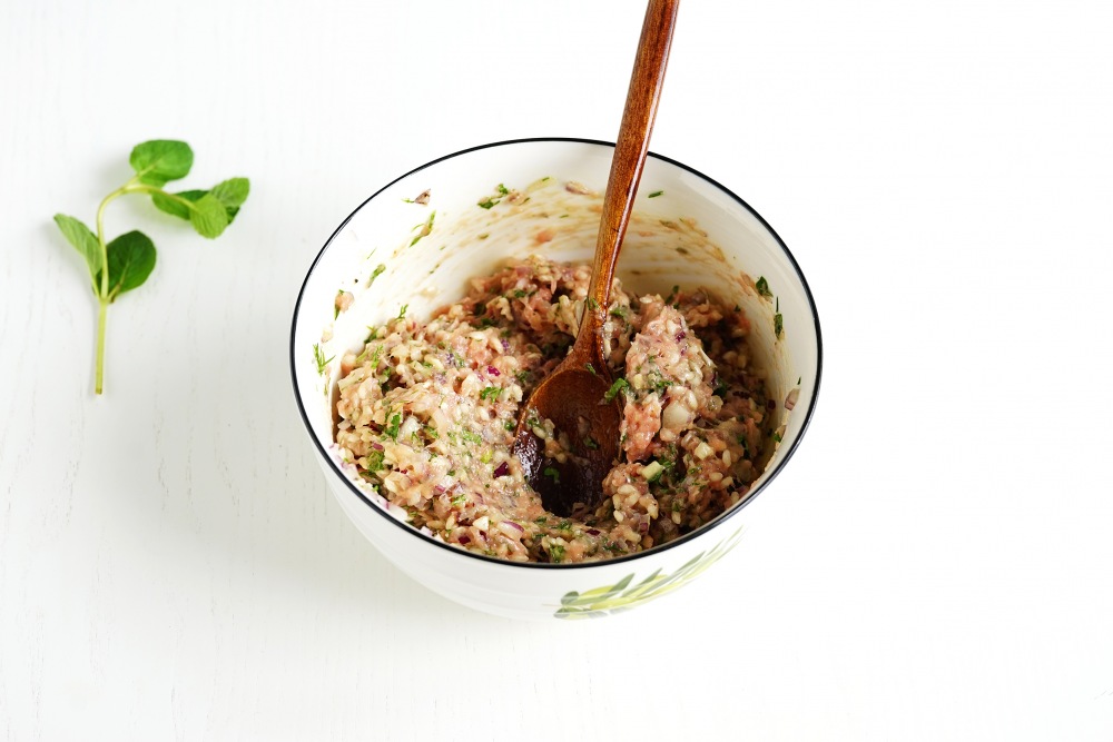 Фарш должен быть охлаждённым. В рецепте использовался куриный фарш. Его можно заменить на то же количество свиного, говяжьего или фарша индейки. Также его можно и вовсе убрать из рецепта. В классическом варианте приемлемы два вида начинки – с мясом и без.