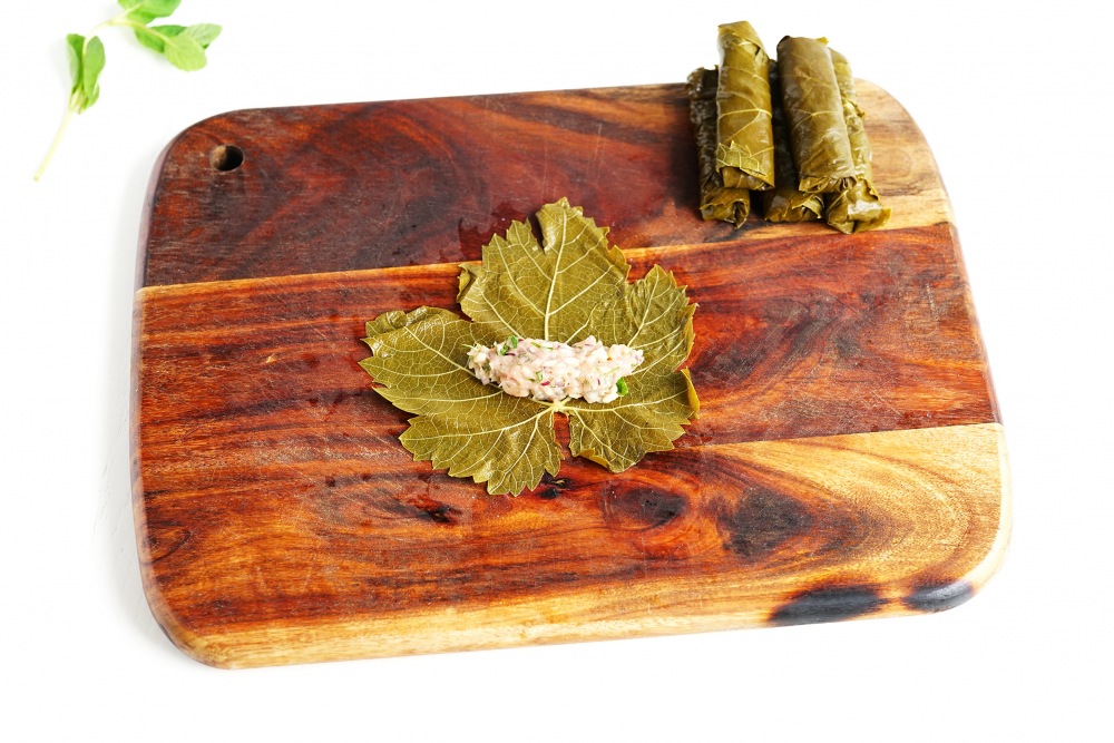 В рецепте используются виноградные листья. Если вы берете свежие, то их нужно предварительно промыть, выложить в кипящую воду и проварить в течение 5 минут. После переложить листья в холодную воду для того, чтобы остановить приготовление. Это позволит сделать их более мягкими и податливыми для дальнейшего приготовления.