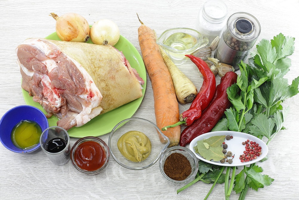 Подготовить необходимые ингредиенты для приготовления свиной рульки.