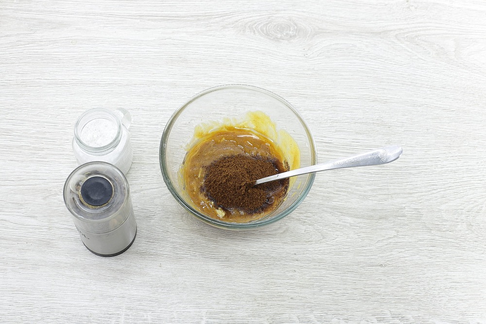 Всыпать молотый кофе. Подсолить и поперчить по вкусу. Перемешать и отставить в сторону, чтобы все ингредиенты подружились друг с другом.