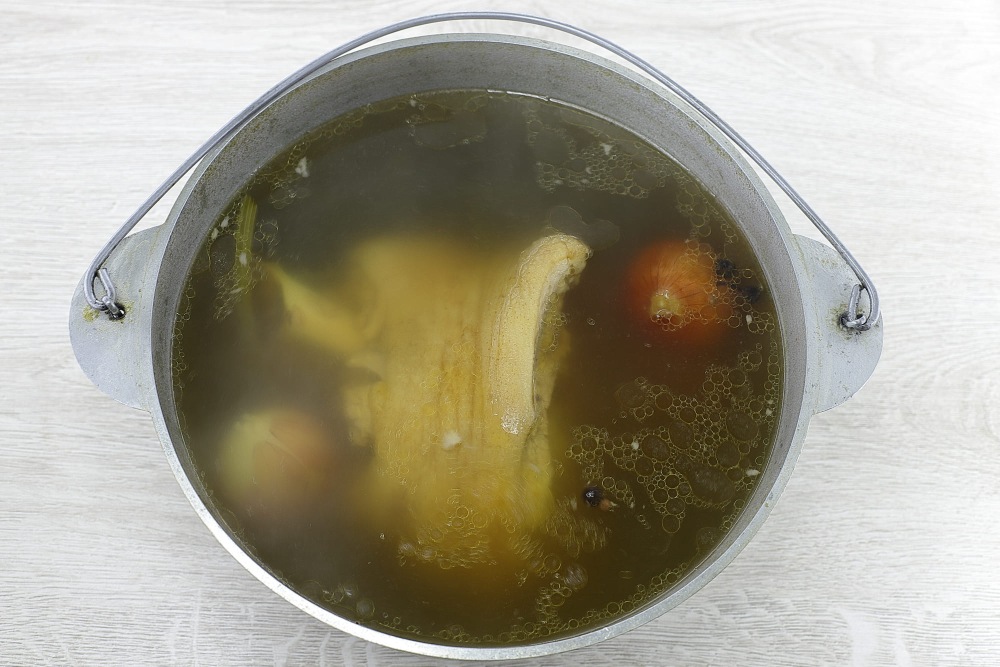Влить воду. Если есть возможность, использовать очищенную, родниковую или бутылированную. Вместо воды можно взять пиво. Слой жидкости над мясом, примерно, 5-7 см. Добавить немного соли и отправить на сильный огонь. С момента закипания убавить огонь до маленького и варить до мягкости.