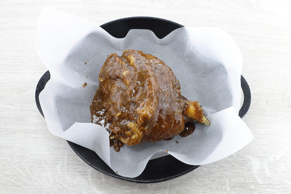 Форму для запекания застелить пергаментом или фольгой. Выложить рульку. Смазать маринадом со всех сторон, используя кухонную кисточку. Заранее разогреть духовку на 200 градусов. Отправить запекаться до румяности. Мне понадобилось 25 минут на среднем уровне в обычной газовой духовке.