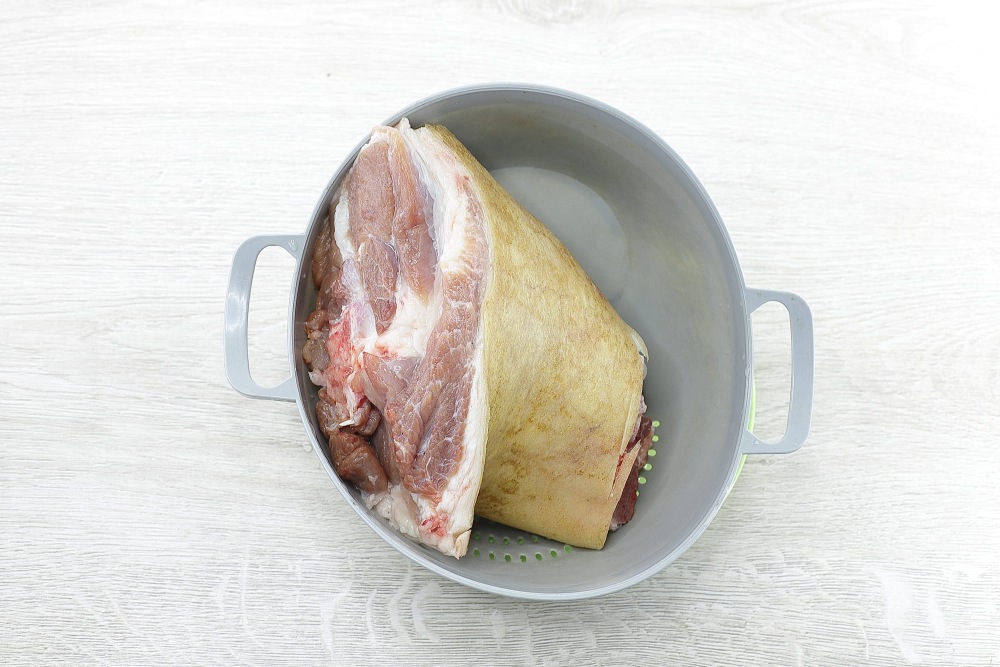 Рульку хорошо поскоблить ножом, при необходимости обжечь над пламенем горелки остатки щетины. Хорошо промыть проточной холодной водой.