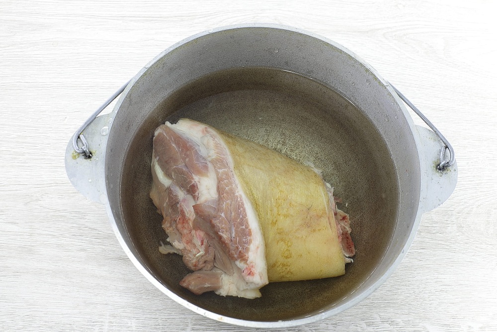 Подобрать подходящую по размеру посуду для варки. Я буду использовать казан на 6 литров. Опустить рульку в казан. Влить воду, чтобы мясо было полностью покрыто жидкостью. Отправить на сильный огонь и довести до кипения. Проварить 3-4 минуты на умеренном огне.