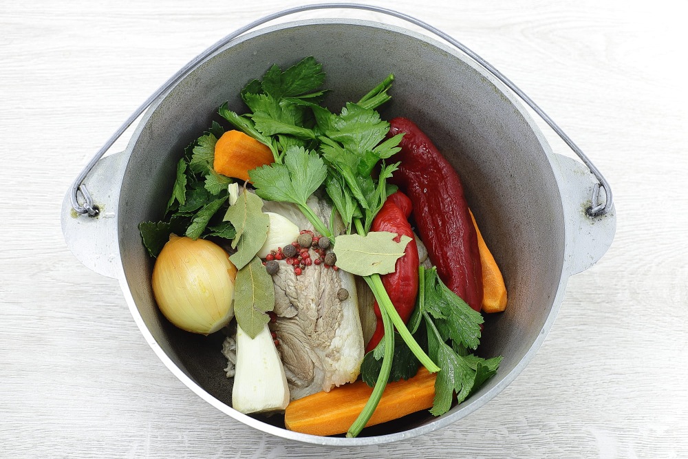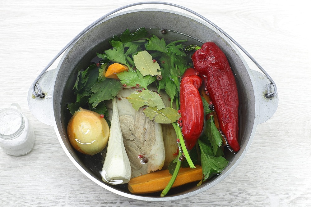 Промыть казан. Вернуть обратно рульку. Заранее промыть и опустить в казан вместе с шелухой лук, сладкий и перец чили (я не очищаю от семян, использую в целом виде), очищенные пастернак и морковь (их разрезаю на 2-4 части), веточки сельдерея, розовый и душистый перец в горошке, лавровый лист, половину очищенного чеснока.