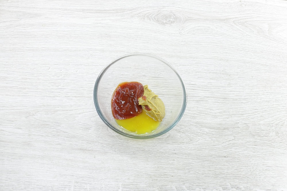 Для маринада взять глубокую миску. Добавить кетчуп, горчицу, мед. Перемешать.