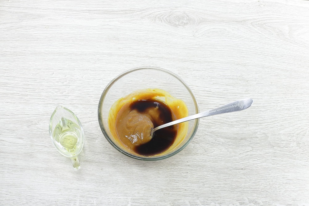Влить соевый соус и масло растительное без запаха. Перемешать.