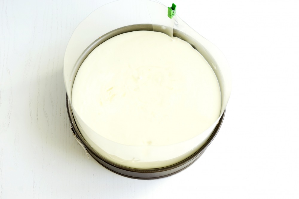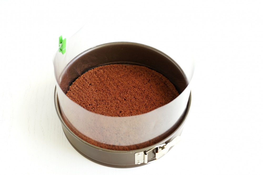 На дно формы выложить бисквит и по бокам установить ацетатную плёнку. Её можно купить в любом кондитерском магазине. Если вы её не нашли, можно просто обернуть бока формы пищевой плёнкой.