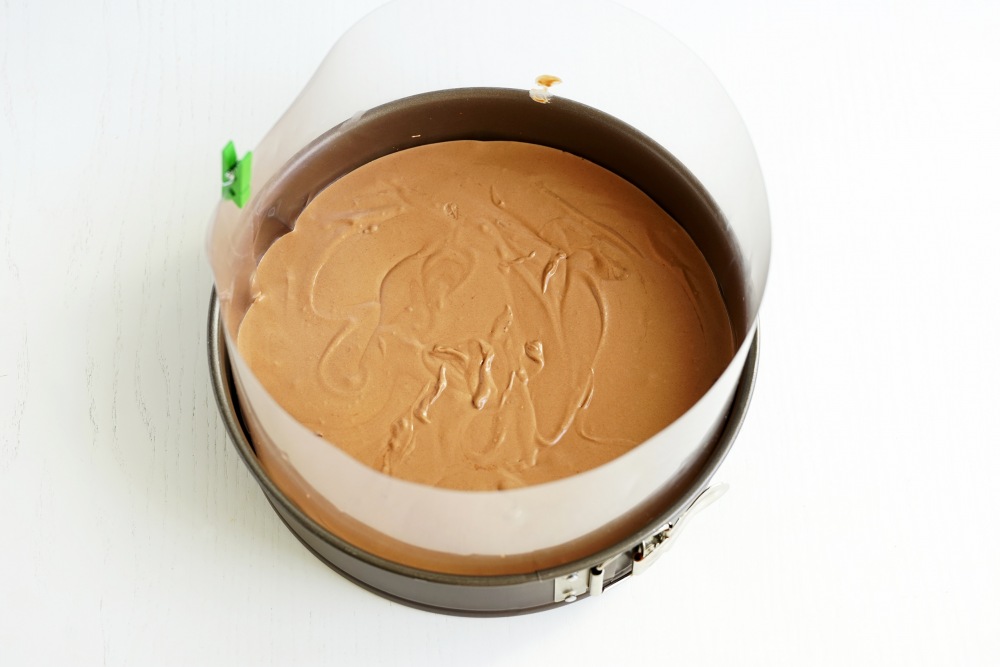 Достать форму с тортом из холодильника. Шоколадный слой из горького шоколада уже слегка схватился. Сверху аккуратно вылить шоколадную массу из молочного шоколада и убрать форму обратно в холодильник.