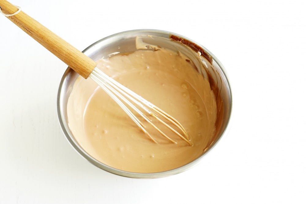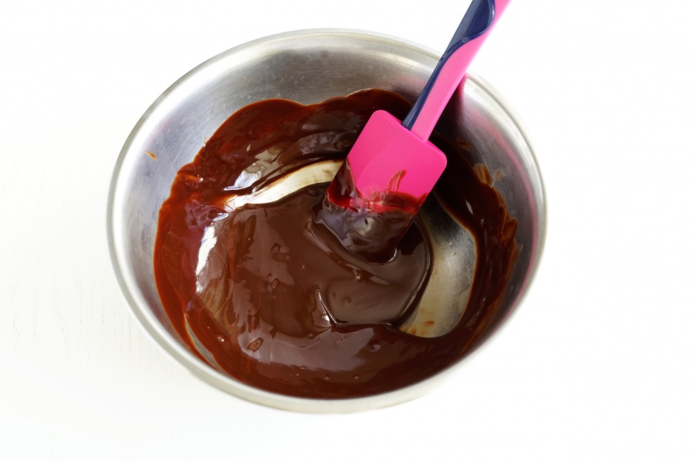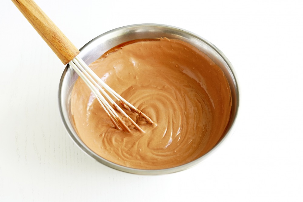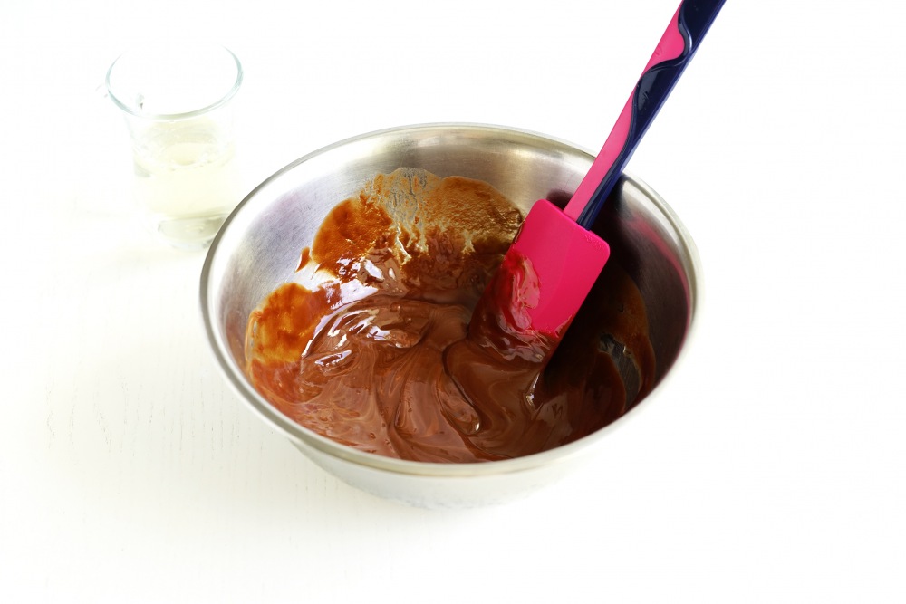 Добавить к растопленному шоколаду 1/3 часть растворённого желатина и всё хорошо перемешать.