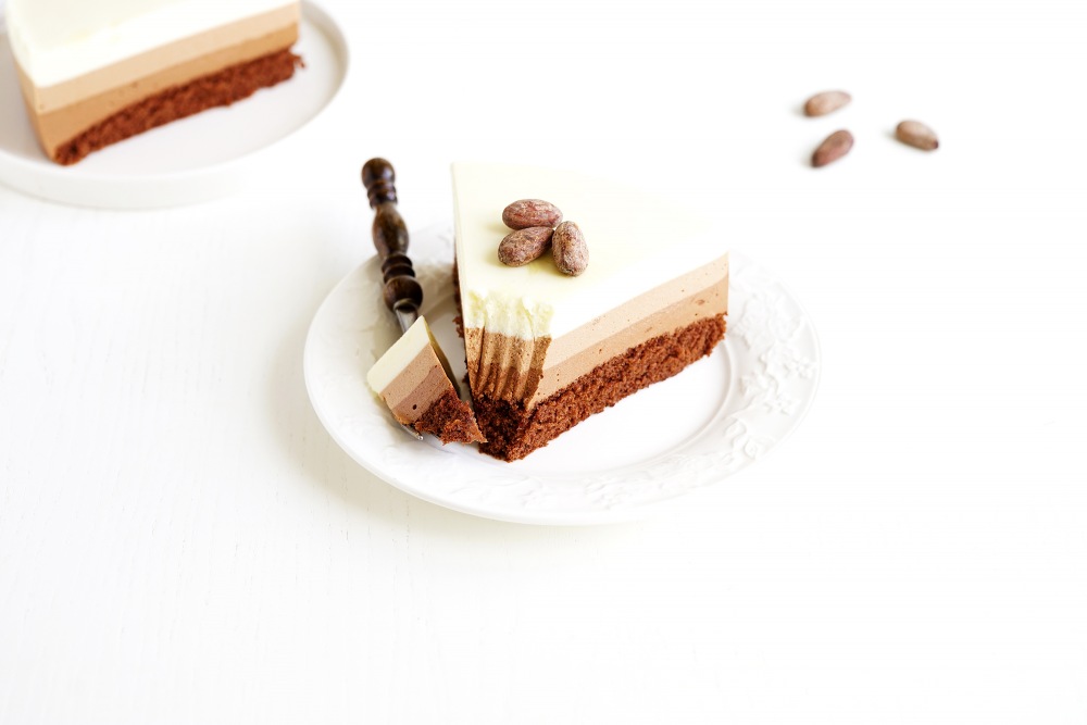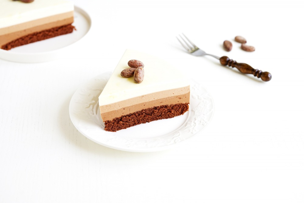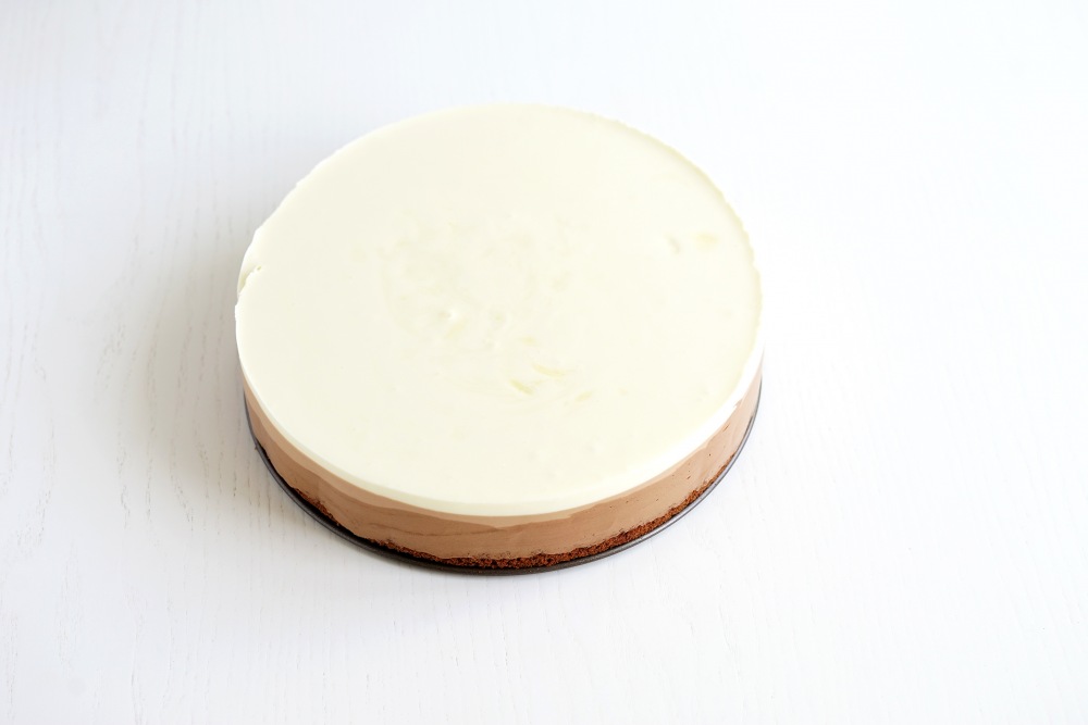 Достать форму с тортом из холодильника и аккуратно вылить слой из белой шоколадной массы на молочную. Убрать торт Три шоколада в холодильник на 2-3 часа для застывания.