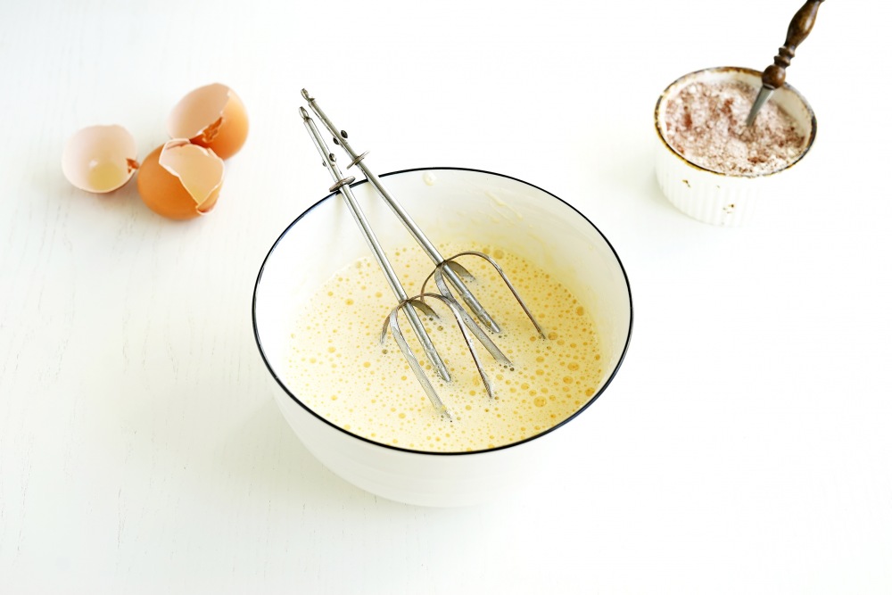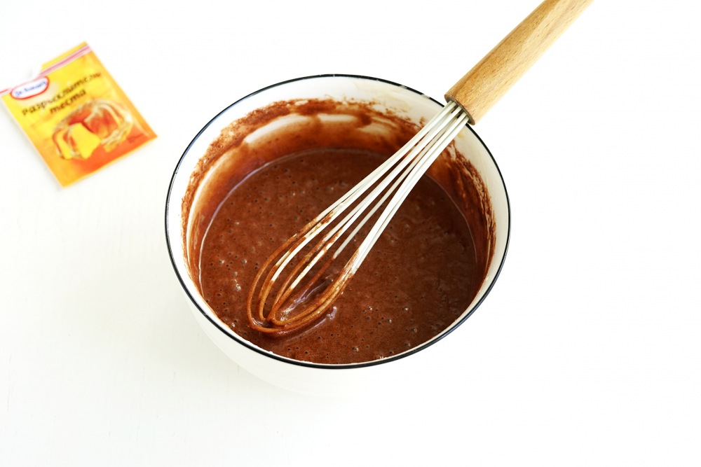 Отдельно смешать муку, разрыхлитель и какао. Частями добавлять сухую смесь во взбитые яйца, каждый раз аккуратно перемешивая, чтобы яйца не осели. В самом конце добавить растительное масло и перемешать.