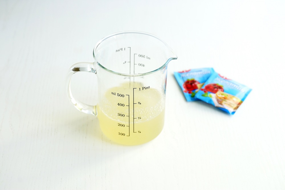 Подготовить желатин. Залить весь желатин холодной водой, дать набухнуть около 7 минут и после растопить на маленьком огне.