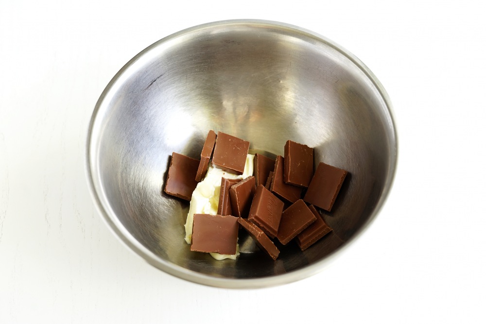 Приготовить второй шоколадный слой – из молочного шоколада. Выложить в чистую миску 50 г сливочного масла, добавить молочный шоколад. Всё растопить на водяной бане или в микроволновой печи. Влить в шоколадную массу 1/3 часть растворённого желатина и перемешать.