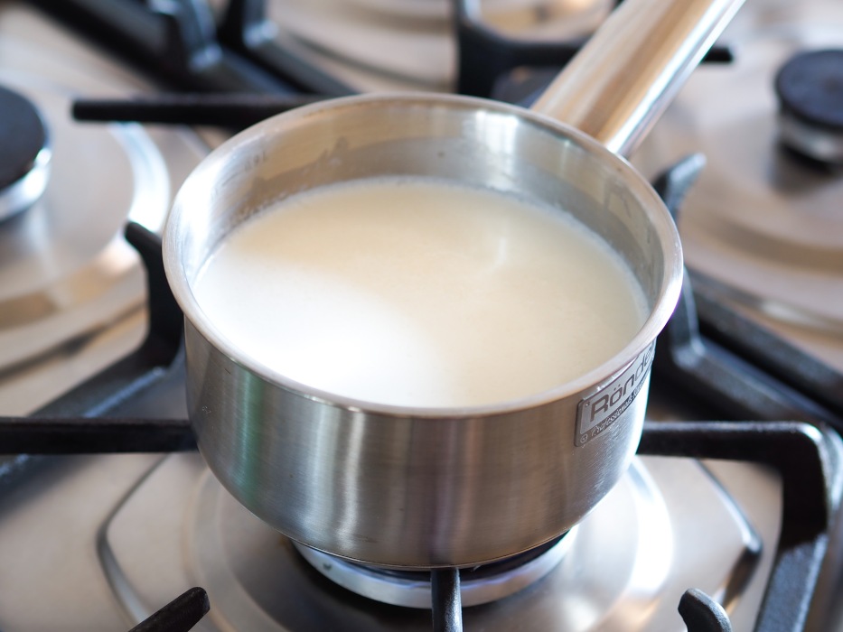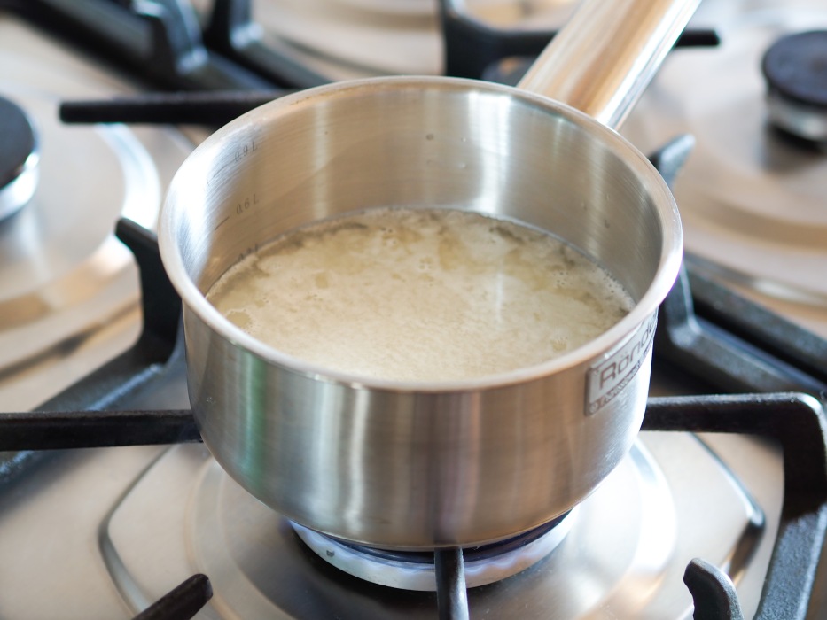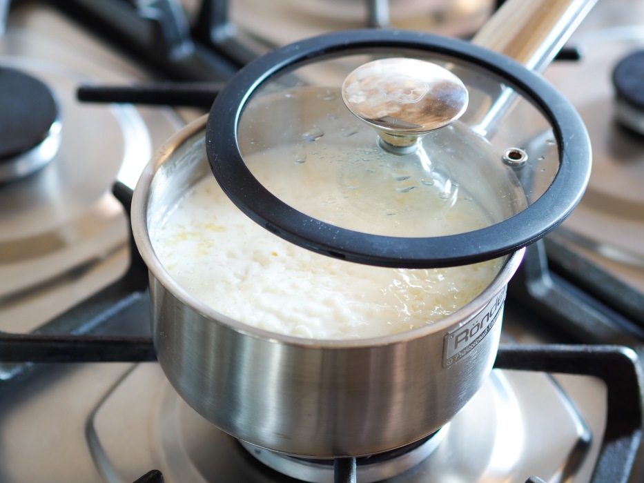 Довести молоко до кипения и убрать огонь до минимума. Молоко с рисом должно слегка кипеть.