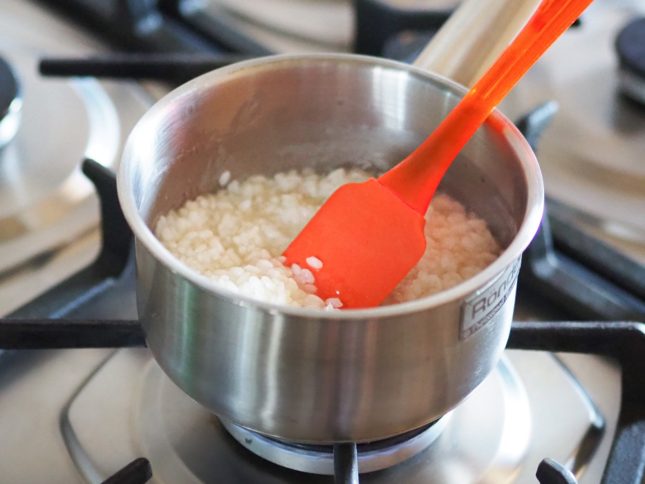 Поставить вариться рис с водой на средний огонь. Рис необходимо постоянно помешивать, чтобы он не прилип ко дну сотейника. Этот этап может занять от 5 до 12 минут, всё зависит от качества риса.